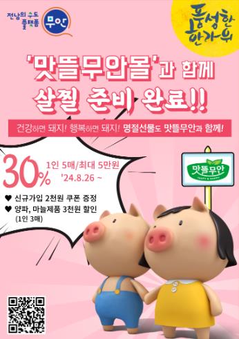 [뉴스서치] 전남 무안군은 다가오는 추석을 맞아 농특산물 온라인 판매처 ‘맛뜰무안몰’에서 30% 할인 기획전을 진행한다.