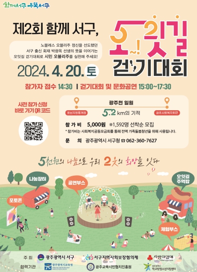 ‘오잇길 걷기대회’는 참가비 ‘오천원’내고 광주천 따라 5.2㎞를 걸으며 ‘이웃’들과 희망을 잇는 행사로 지난해 처음 시작됐다. 특히 주민들의 자발적인 참여를 통해 일상 속 나눔문화를 확산하고 가족돌봄청년(영케어러)들을 지원하는 데 그 의미가 있다. 서구는 지난해 첫 번째 행사 후 참가비 600여 만원을 가족돌봄청년 대학교 입학금으로 지원한 바 있다.