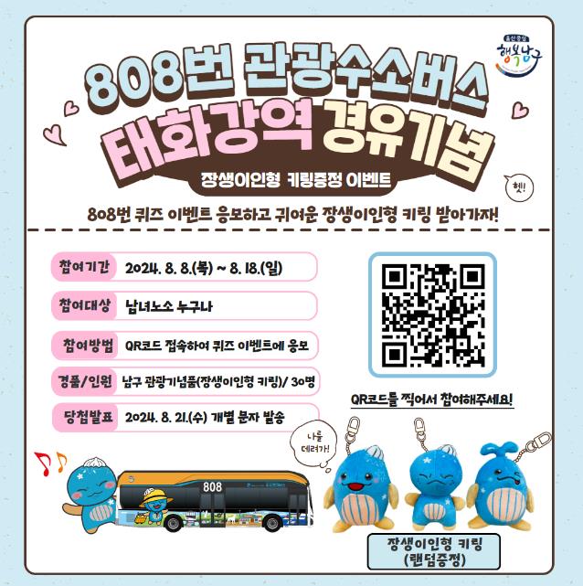 이번 이벤트는 누구나 응모할 수 있고, 큐알코드를 스캔해 퀴즈이벤트에 참여하면 무작위 추첨을 통해 당첨자 30명에게 남구의 관광기념품을 발송할 예정이다.