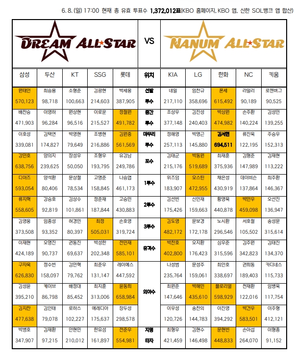 가장 각축을 벌이는 포지션은 나눔 올스타 2루수 부문이다. NC 박민우가 45만 9,098표로 1위를 달리고 있고 한화 황영묵이 44만 878표를 획득하며 1만 8,220표 차이로 각축을 벌이고 있다. 롯데 정철원과 삼성의 고졸신인 배찬승이 1,2위를 달리고 있는 드림 올스타 중간투수 부문도 1만 9,879표 차이로 근소한 차이를 보이고 있다.