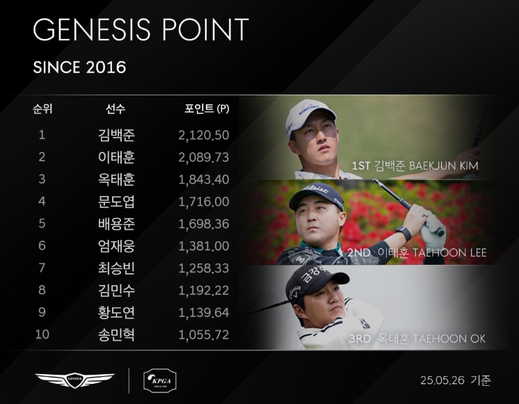 옥태훈(27.금강주택)이 1,843.40포인트로 제네시스 포인트 3위 자리를 지켰고 ‘제44회 GS칼텍스 매경오픈’ 챔피언 문도엽(34.DB손해보험)이 ‘코오롱 제67회 한국오픈’에서 공동 32위로 146포인트를 추가하며 제네시스 포인트 4위, ‘KPGA 클래식’ 우승자 배용준(25.CJ)이 1,698.36포인트로 제네시스 포인트 5위에 자리했다.