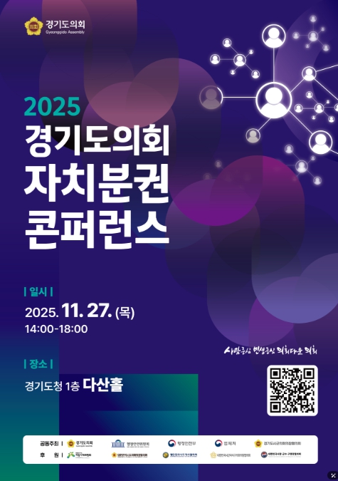 [뉴스서치] 경기도의회가 진정한 자치분권 실현에 대한 사회적 공감대 확산과 향후 지방자치의 발전 방향 모색을 위한 '2025 경기도의회 자치분권 콘퍼런스'를 오는 11월 27일 목요일 경기도청 다산홀에서 개최한다.