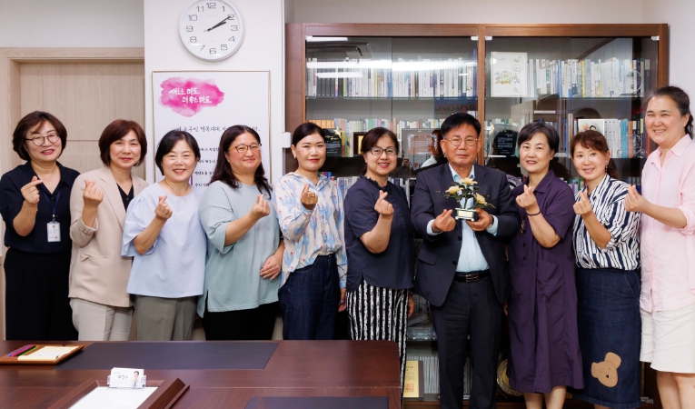 ▲ 박강수 마포구청장(오른쪽에서 네 번째)이 한국중증중복뇌병변장애인부모회로부터 감사패를 전달받았다. |