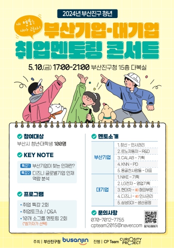 [뉴스서치] 부산진구는 오는 5월 10일 부산기업․대기업 취업을 희망하는 청년을 대상으로 ‘2024년 상반기 부산진구 청년 취업콘서트’를 개최한다고 밝혔다. 작년 7월 부산 자치구 최초로 선보인 취업콘서트는 청년들의 높은 호응도 및 다양한 의견을 반영하여 올해 상・하반기 2회로 횟수를 늘렸으며, 부산기업도 대거 참여한다.