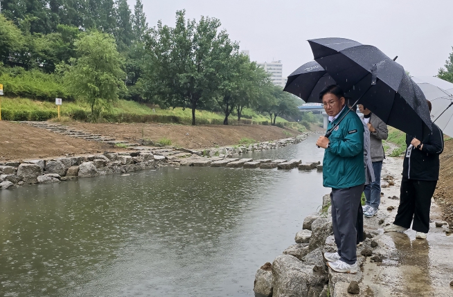 이날 박강수 마포구청장과 관계 부서 공무원은 하천 수위와 유속을 확인하고 하천 진출입 차단시설 등 안전 조치가 제대로 작동하는지 살폈다.