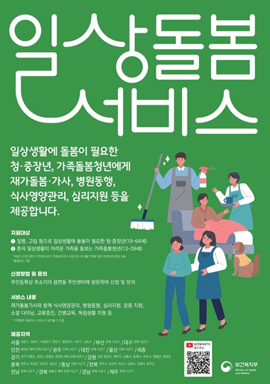 일상돌봄 서비스는 돌봄이 필요한 청·중장년(만 19~64세)과 질병·정신질환 등을 앓고 있는 가족을 돌보는 가족돌봄청년(만 13~39세)을 대상으로 기본서비스와 특화서비스를 지원하는 사업이다.