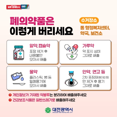 이에, 폐의약품은 일반 종량제봉투를 이용한 배출이 아닌 약국, 보건소 또는 가까운 동 행정복지센터로 가져가 배출해야 한다.