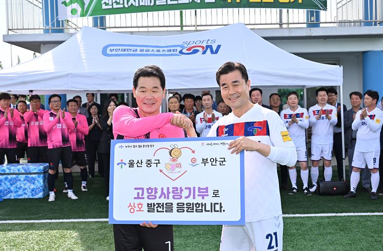 [뉴스서치] 울산 중구와 전북 부안군이 지난 5월 27일 오후 4시 30분 부안스포츠파크에서 열린 ‘자매 친선도시 교류행사’ 공식 행사에서 고향사랑기부금 200만 원을 상호 기부했다.