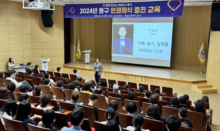 [뉴스서치] 울산 동구는 8월 27일 오후 3시 동구청 5층 중강당에서 직원 및 구민들을 대상으로 2024년 울산 동구 인권의식 증진 교육을 실시했다.