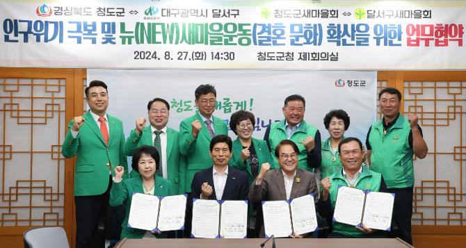 [뉴스서치] 대구 달서구가 27일 청도군에서 청도군·청도군새마을회와 초저출생 인구 위기에 공동 대응하고, 뉴(NEW)새마을운동(결혼문화) 확산 등을 위한 업무 협약을 체결했다.