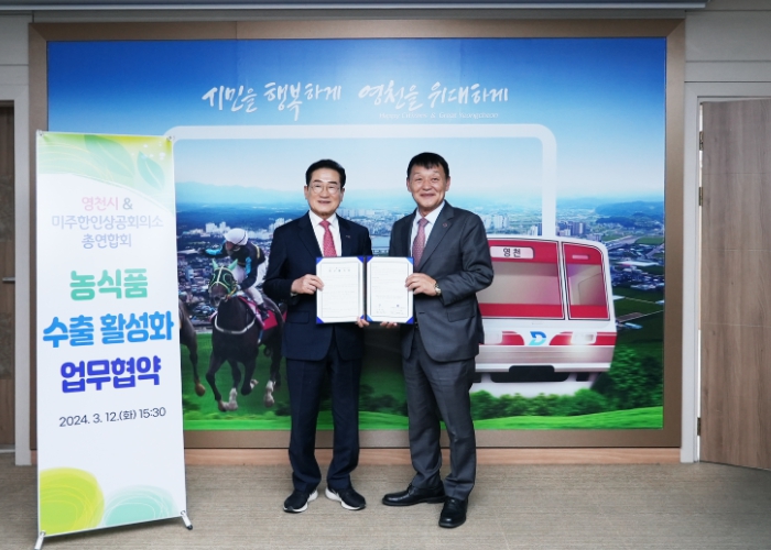 [뉴스서치] 영천시는 지난 12일 시청에서 미주 한인상공회의소 총연합회 회장단 일행을 접견하고 영천시 농식품 수출 활성화에 대한 협력 방안을 논의한 후 미국 시장 진출 확대를 위한 업무협약을 체결했다.