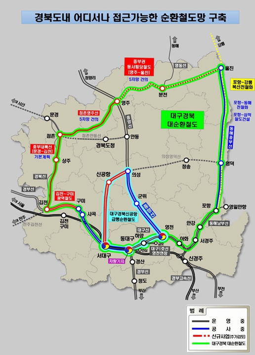 대구경북대순환철도망은 올해 개통예정인 ▴동해중부선(포항~울진), 기본계획 수립 중인 ▴중부내륙선(문경~김천)과 현재 운영 중인 ▴동해남부선(포항~경주), 중앙선(영천~경주), ▴대구선(동대구~영천), ▴경부선(동대구~김천), ▴점촌~영주선, 미연결 구간인 ▴분천~울진 구간을 연결할 작정이다.