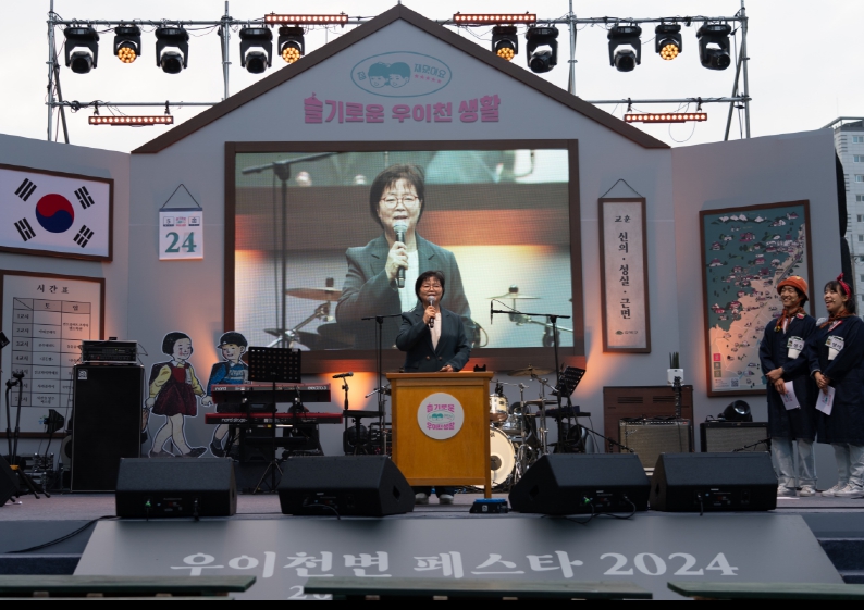 ▲ 이순희 서울 강북구청장이 지난 24일 우이천 번창교에서 열린 ‘우이천변 페스타2024, 슬기로운 우이천 생활’ 축제 개막식에서 인사말을 전하고 있다. |
