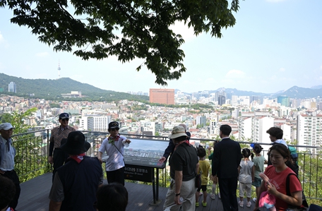 ▲ 남산자락숲길 전망대에서 김길성 중구청장과 어린이, 국가유공자들이 함께 휴식을 취하며 서울 시내를 내려다보고 있다. |