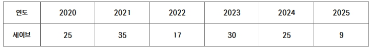 ▲ 롯데 김원중 연도별 세이브 (2025. 4. 30 기준) |