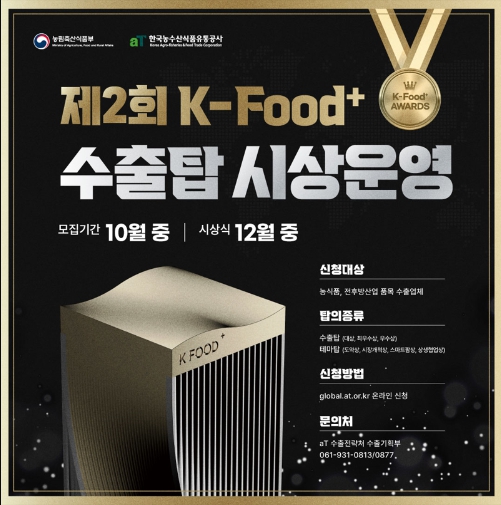 [뉴스서치] 농림축산식품부는 '제2회 케이푸드 플러스(K-Food+) 수출탑'을 올해 12월에 시상할 계획이라고 밝혔다.