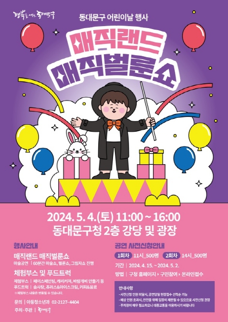 동대문구청 2층 강당에서 진행되는 매직벌룬쇼는 오전 11시, 오후 2시 총 2회 공연으로 60분 동안 진행된다. 공연은 온라인 접수를 통해 사전 신청을 마쳤으며, 사전 신청을 하지 못한 구민에게는 공연 당일 선착순으로 현장 접수를 통해 입장권 100매를 추가로 배부할 예정이다.
