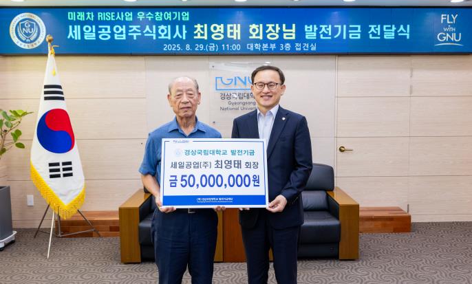 [뉴스서치] 경상국립대학교는 미래차 RISE사업 우수 참여기업인 세일공업(주)가 대학발전기금 5000만 원을 출연하기로 약정했다고 밝혔다.