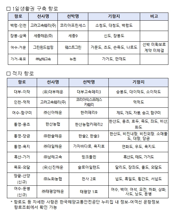 해양수산부는 연안여객선의 항로 단절을 막고 섬 주민의 1일 내 육지 왕복을 실현하기 위해 2018년부터 운항결손금의 일부를 지원하는 ‘연안여객항로 안정화 지원사업을’ 추진해 오고 있다. 올해는 상반기에 적자항로* 8곳과 1일 생활권 구축 항로 4곳을 선정했으며, 하반기에는 지난 8월 25일부터 9월 5일까지 신청을 받은 후 학계·연구기관·현장전문가 등으로 구성된 항로선정위원회의 심사를 거쳐 2개 지원항로를 추가로 선정했다.