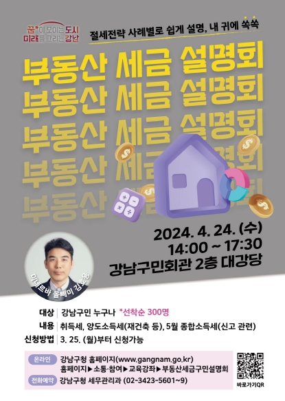 [뉴스서치] 꿈이 모이는 도시, 미래를 그리는 강남구가 24일 오후 2시~5시 30분에 구민회관 대강당(삼성로 154)에서 구민 450명을 대상으로 ‘부동산 세금 설명회’를 개최한다.