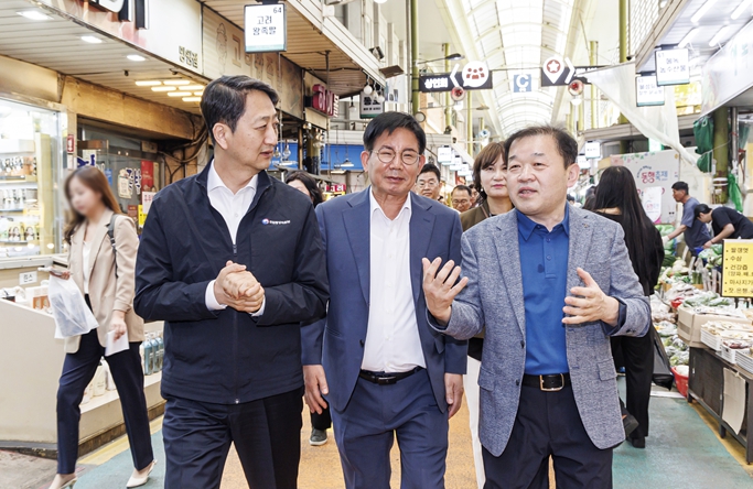 ▲ 박강수 마포구청장(가운데)이 안덕근 산업통상자원부 장관과 망원시장을 방문했다. |