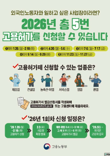 | ▲ 고용노동부, 고용허가제(E-9) 신청하세요, 2026년 1회차 접수 시작 |