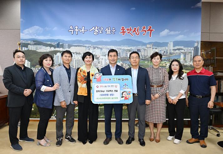 [뉴스서치] (사)시니어벤처협회 울산지회가 6월 10일 오후 3시 30분 중구청 구청장실을 방문해 500만 원 상당의 이웃돕기 김치 5kg 150상자를 전달했다.