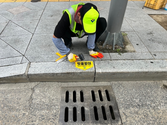 빗물받이는 도로 원활한 빗물 배수 및 침수 피해를 예방하는 시설물로, 구는 주요 도로 중 활엽수 가로수가 근처에 있어 침수 위험이 큰 곳, 쓰레기 등 무단투기가 많은 상가 밀집 지역, 주변 빗물받이 도로 경계석에 스티커를 부착했다.