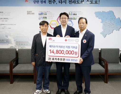 [뉴스서치] 전주시는 12일 전주시청에서 정진 효자추모관 회장 등이 저소득 폐지 수거 어르신 74명에 1480만원 상당의 온누리상품권을 기부했다고 밝혔다.