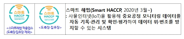이에 식약처는 도축장 및 집유장도 스마트 해썹 적용업소로 등록할 수 있도록 스마트 해썹 등록 신청 절차·방법을 마련하고 스마트 해썹 심벌을 사용할 수 있는 우대 조치 근거 등을 마련했다.
