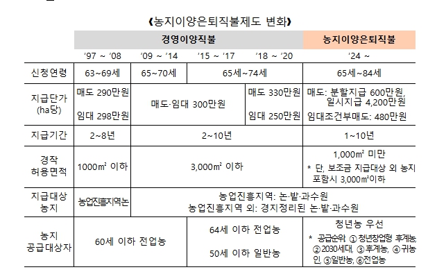 농지이양은퇴직불은 ’97년 도입된 경영이양직불을 ’24년에 기존 임대 중심에서 매도 중심으로 농지이양 방식을 개편한 제도로 영농에서 은퇴하는 65-84세 고령 농업인의 안정적인 노후소득 보장을 지원하는 한편, 청년농 중심의 농지이양으로 영농기반이 취약한 청년농의 영농 정착 및 규모화를 지원하는 제도이다.