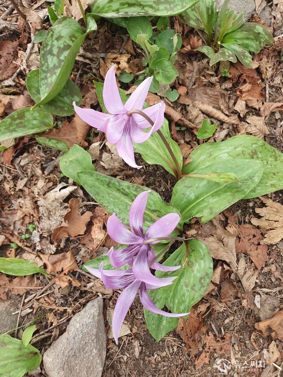 명지산 능선에서 만난 얼레지 군락. ‘얼레지’는 백합과의 여러해살이풀로 ‘가재무릇’이라고도 한다. 잎에는 자주색 무늬가 있고 꽃은 아래를 향해 달린다. 기온이 25℃ 이상이 되면 꽃잎이 완전히 뒤로 젖혀지는데 그 모습이 치마폭을 발랑 뒤집어 쓴 여인과 닮았다고 하여 얼레지의 꽃말은 ‘바람난 여인’이라고 한다. 명지산 능선과 연인산 능선에는 5월에 얼레지꽃이 지천에 피어있다.
