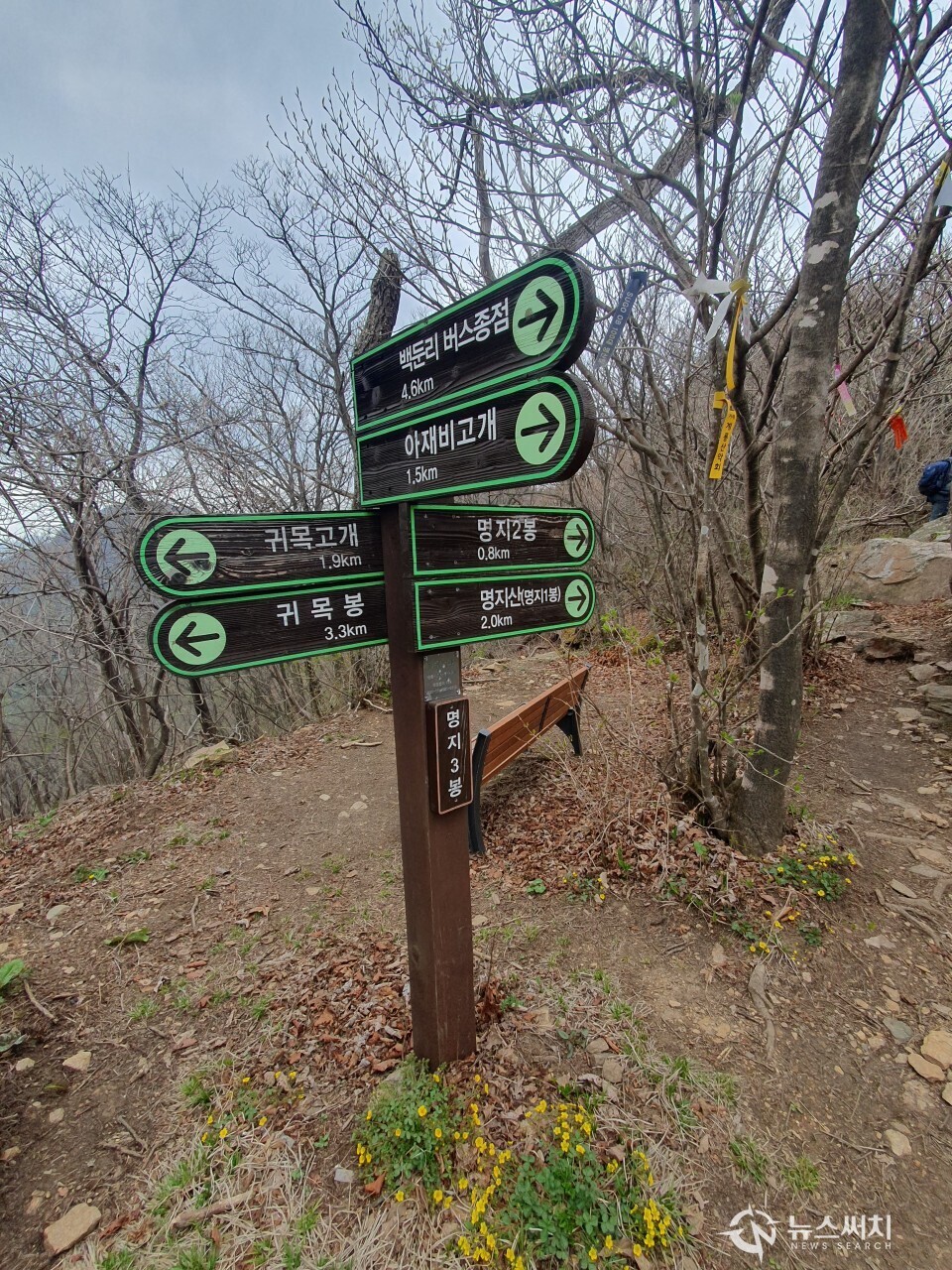 명지3봉 이정표. ‘아재비고개’에서 북쪽방향으로 약 1.5km 정도 오르면 해발 1.199m 높이의 봉우리에 도달하게 된다. 바로 ‘명지3봉’인데 명지산의 봉우리 중 3번째로 높은 봉우리이며, 명지산 3개 봉우리 중에서 가장 조망이 좋다. 귀목고개에서 동쪽방향으로 약 1.9km 정도 올라도 ‘명지3봉’에 도달할 수 있다.