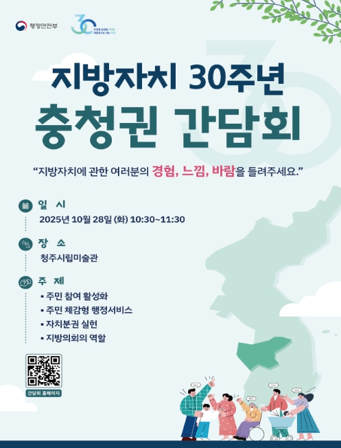 한편, 행정안전부는 지방자치 30주년 권역별 간담회 누리집을 개설해 지방자치에 대한 주민 의견과 간담회 참석 신청을 접수 중이며, 간담회 개최 결과 및 주요 의견 등도 확인할 수 있다.