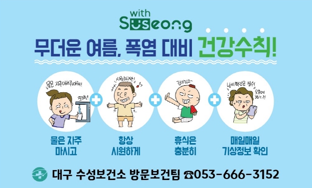 이 밖에 수성구보건소는 방문건강관리 대상자 가운데 폭염기 건강취약계층 1,100명을 선정해 영양불균형을 해소와 온열질환 예방에 도움이 되는 곡물 선식과 건강 물품 배부를 이달 말까지 완료할 예정이다.