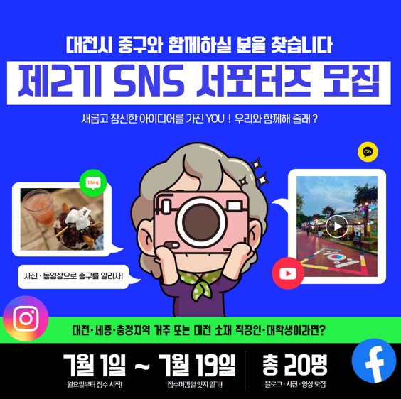 [뉴스서치] 대전 중구는 오는 7월 19일까지 중구 공식 소셜미디어에서 다양한 중구의 소식과 매력을 전할 제2기 중구 소셜미디어 서포터즈를 모집한다고 밝혔다.
