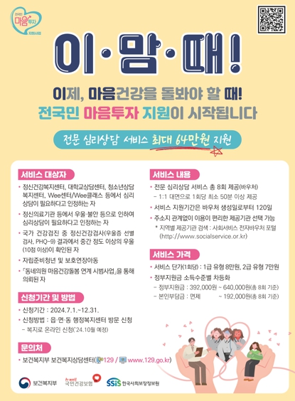 지원 대상은 △정신건강복지센터, wee센터/wee클래스, 정신의료기관 등에서 심리상담이 필요하다고 인정한 사람 △국가건강검진 중 정신건강검사에서 중간 정도 이상의 우울(10점 이상)이 확인된 사람 △자립준비청년 및 보호연장아동 등이다.