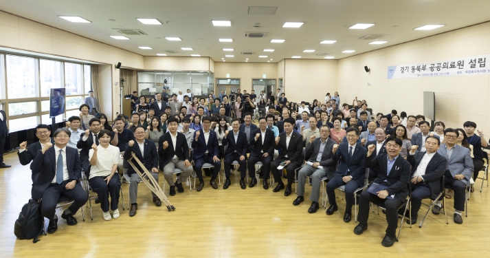 ▲ 26일 오후 옥정호수도서관에서 열린 공공의료원 설립 현장 설명회에서 김동연 경기도지사, 강수현 양주시장, 보건의료 전문가, 지역주민 등이 기념촬영을 하고 있다.