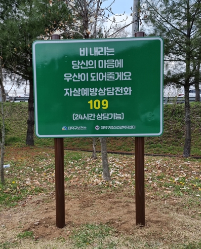 대덕구에 따르면 이번 표지판은 대청공원 내 정자 4곳 및 미호교 인근 주차장에 설치했으며, 표지판에는 ‘혼자서는 힘들지만 함께라면 괜찮습니다’, ‘힘든 삶 속에서 함께 생각해요’ 등 자살 예방 문구와 24시간 자살 예방 상담번호(109)를 안내해 자살 위기 상황에서 응급처치 및 즉각적인 도움을 요청할 수 있도록 했다.