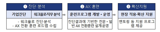 ② 2단계(훈련): 대표이사(CEO) 대상의 인사이트 교육(일반AX)과 실무자 중심의 문제해결형 교육(전문AX)을 병행한다. 실무 훈련은 최소 18시간 이상의 실습 위주로 구성된다.