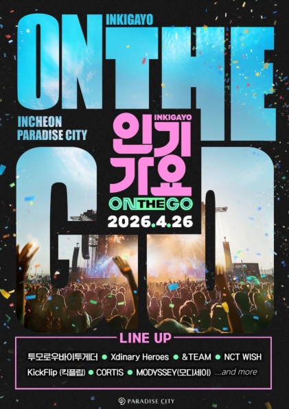 오는 4월 26일 인천 파라다이스시티에서 개최되는 ‘인기가요 ON THE GO’는 SBS 대표 음악 프로그램 ‘인기가요’의 스페셜 공연 프로젝트로, SBS 등촌동 공개홀 생방송 현장의 열기를 그대로 구현하면서 K-POP 팬들이 있는 곳이라면 어디든 직접 찾아가는 콘셉트로 기획됐다. 기존 스튜디오 중심의 음악 방송을 넘어, 보다 확장된 공간에서 팬들과 아티스트가 함께 호흡하는 현장형 공연으로 새로운 관람 경험을 선사할 예정이다.