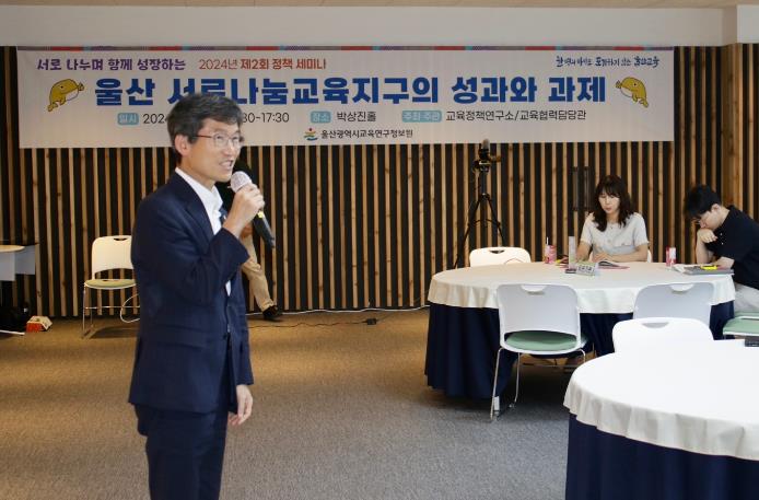 이번 세미나는 울산의 5개 기초지자체와 업무협약을 맺어 추진되고 있는 서로나눔교육지구의 성과와 앞으로의 정책 방향을 모색하기 위해 마련했다.