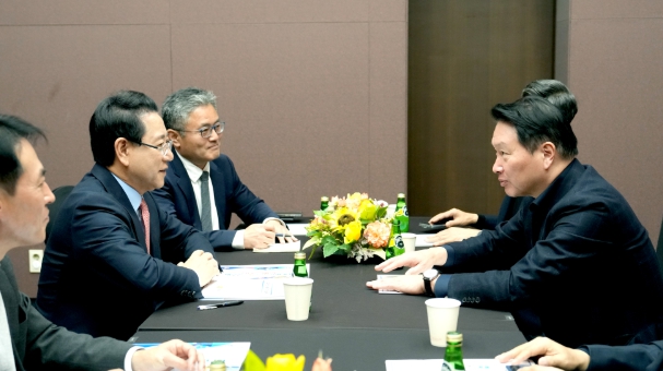 | ▲ 김영록 전라남도지사가 3일 서울 코엑스 오픈미팅룸에서 최태원 SK그룹 회장과 면담을 갖고 ‘오픈AI AI데이터센터’ 등과 관련해 투자협의를 하고 있다. |