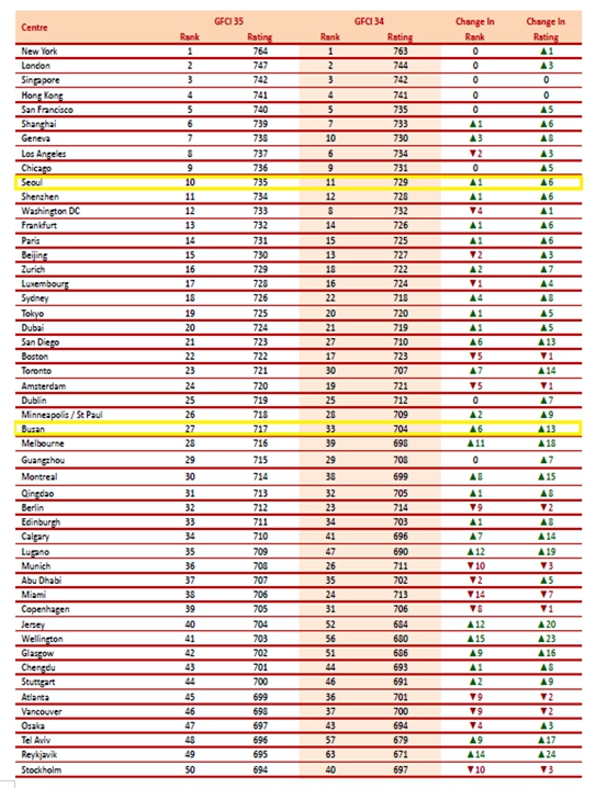 시는 글로벌 금융도시 선정의 주요 평가 요소인 ▲인적자본 ▲비즈니스 환경 ▲금융부문 발전 ▲기반시설 ▲평판, 전 분야에서 지난해 하반기 대비 점수가 큰 폭으로 올라, 역대 최고 점수인 717점을 기록했다.