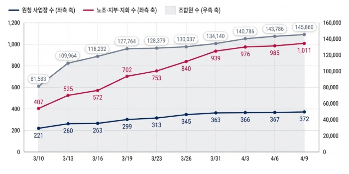 [뉴스서치] 고용노동부는 개정 노동조합법 시행(’26.3.10.) 이후 1개월여 간 현장상황 파악 및 지도를 위해 원청 사업장에 대한 하청 노조의 교섭요구 현황 등을 확인·집계해 왔으며, 법 시행 1개월이 되는 4월 10일, 그간의 집계현황을발표하면서 운영 상황도 함께 점검했다.