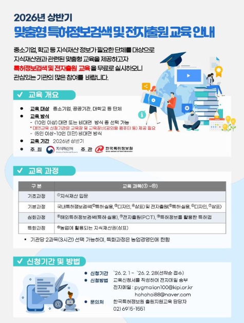 한편, 교육 신청과 관련한 자세한 사항은 지식재산처 누리집에서 확인할 수 있으며, 한국특허정보원 출원지원교육 담당자로 전화 문의도 가능하다.
