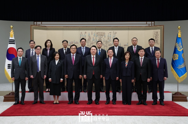 [뉴스서치] 4월 24일 윤석열 대통령은 용산 대통령실에서 정진석 비서실장과 홍철호 정무수석에게 임명장을 수여했다.