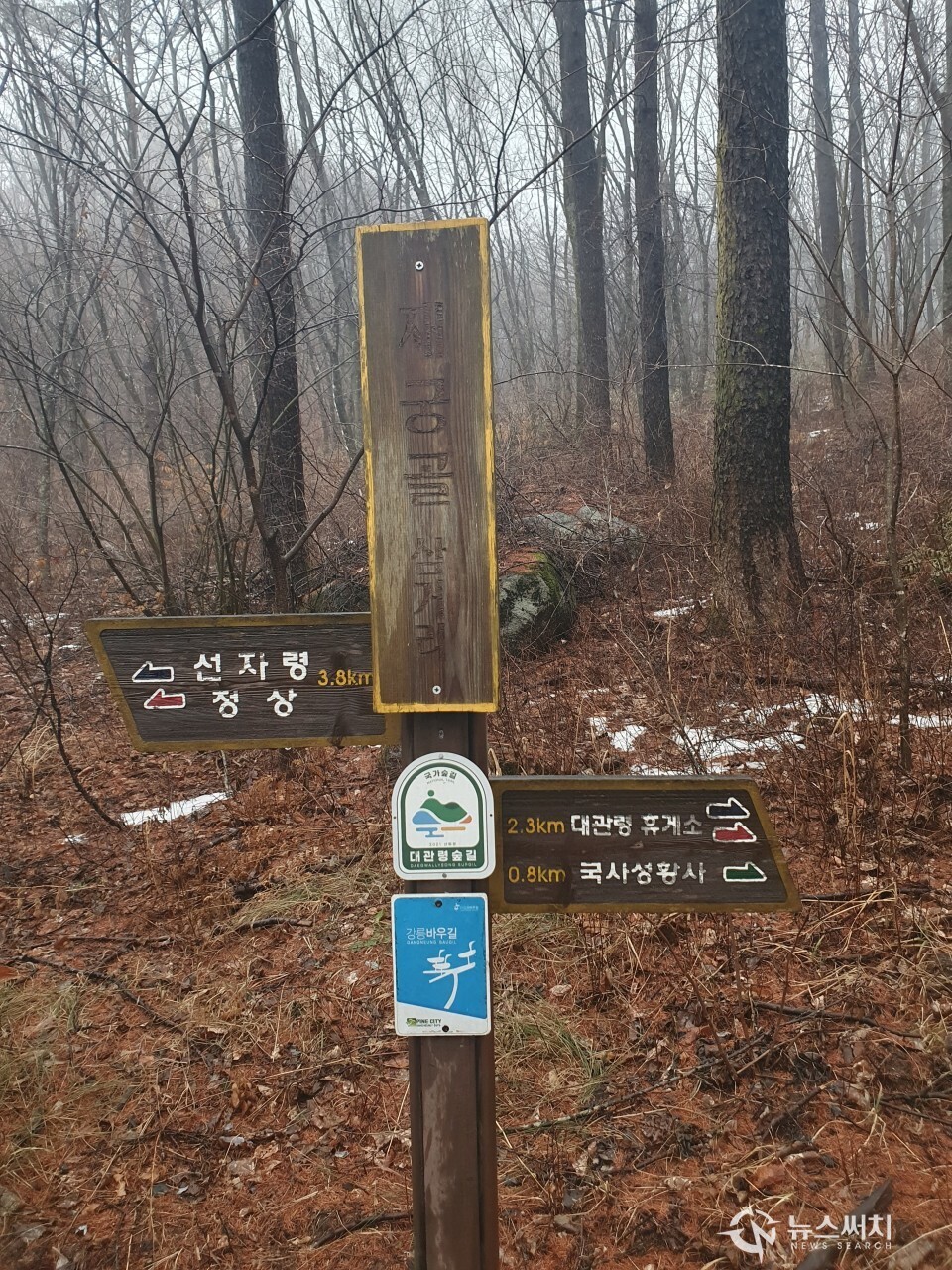대관령 선자령등산로 입구. 대관령마을휴게소에서 약 10분 정도 걸어가면 대관령 선자령등산로 입구가 나온다. 입구에는 큰 돌에 ‘大關嶺國師城隍堂(대관령국사성황당) 入口(입구)’라고 새겨져 있다. 선자령 정상은 해발 1,157m 이지만 출발점인 대관령마을휴게소의 높이가 약 850m 정도 되는 곳이어서 걸을 때 그다지 오르막이 심하지는 않다.