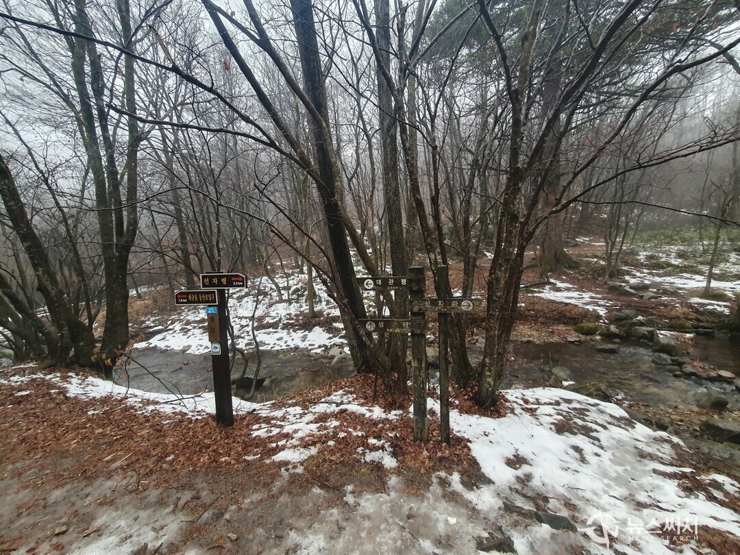 재궁골삼거리 이정표. 선자령에서 대관령 내려가는 길 중에서 대관령하늘목장 입구에서 좌측으로 가시머리천 샘터를 지나 계속 걷다보면 ‘재궁골’ 골짜기에 접어들 수 있다. 이러한 재궁골 골짜기 가운데 삼거리가 있는데 횡계리 마을로 내려가는 길과 대관령양떼목장으로 올라가는 길이 나뉘는 곳이다.
