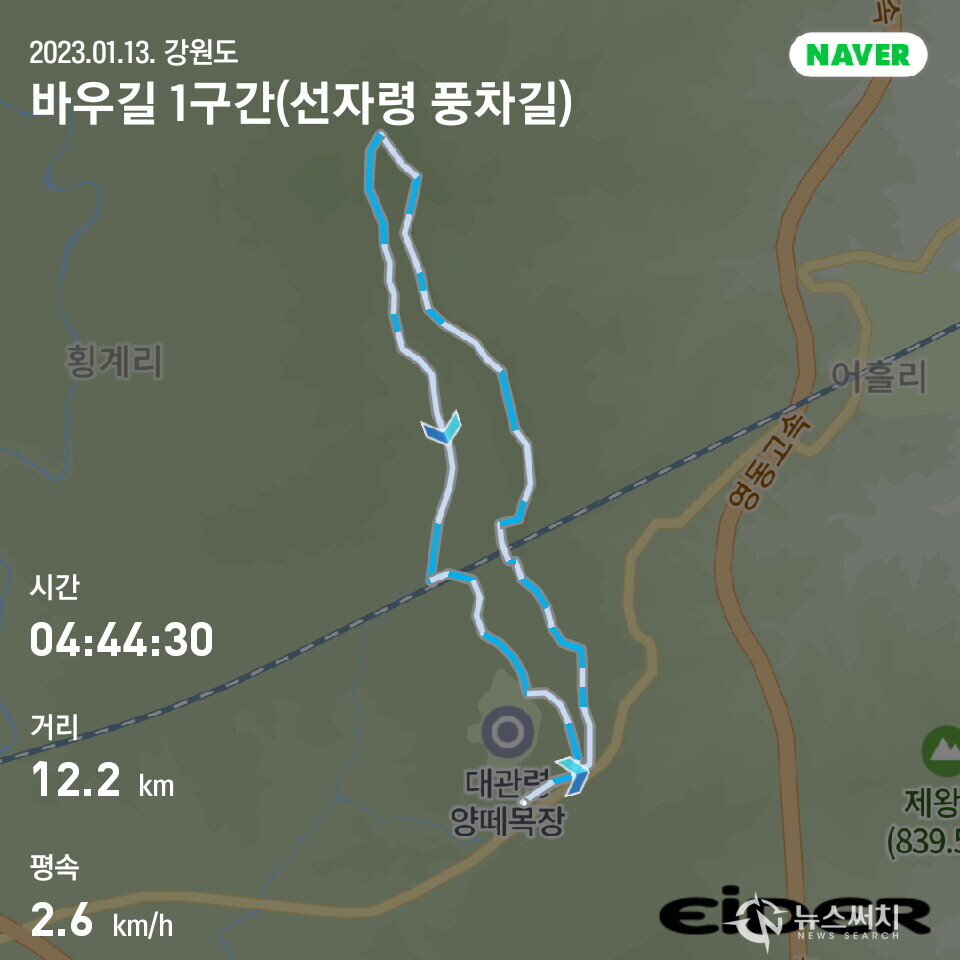 이번 강릉바우길 1구간 ‘선자령 풍차길’ 트레킹 거리는 12.26km 였고, 트레킹 시간은 휴식시간을 포함하여 4시간 44분이 소요되었다.